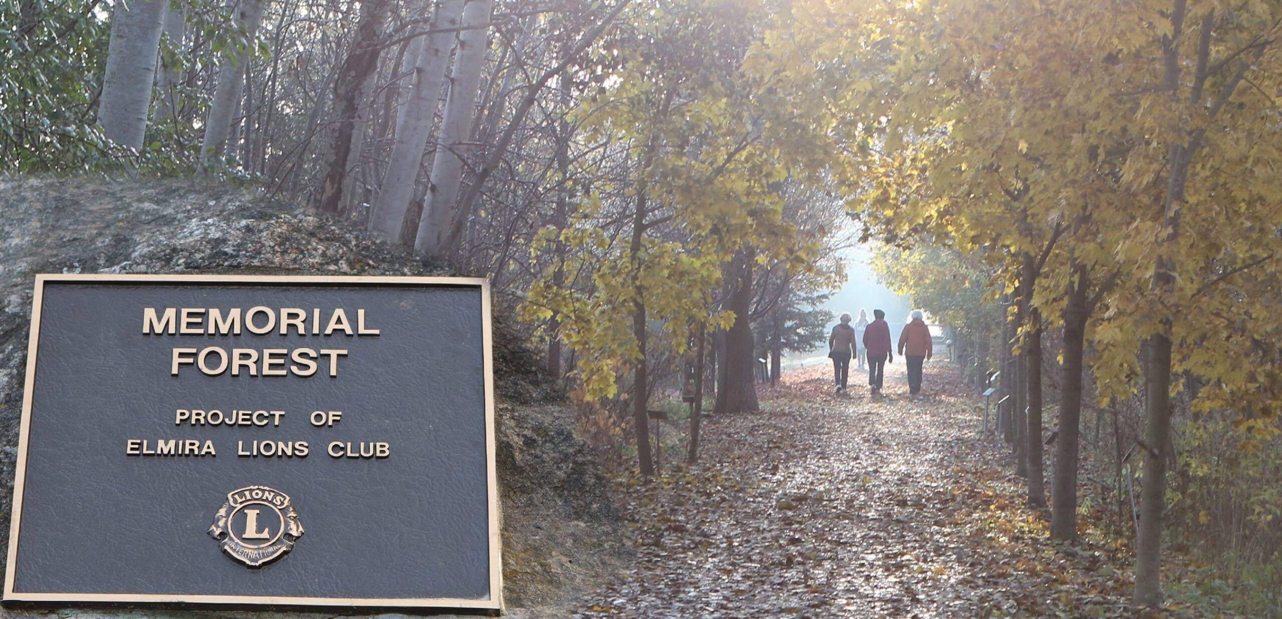 The Elmira Lions Memorial Forest is located along the Kissing Bridge Trail Way adjacent to Snyder Avenue North and along the NE section of Lions Ring Trail. Because it is located adjacent to the Trail way, it is easily accessible for walkers, hikers and bicyclists as well as by automobile from Snyder Avenue North.